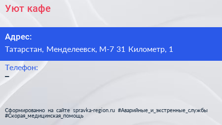 Уют, кафе по адресу Татарстан, Менделеевск, М-7 31 Километр, 1 в дальнейшем Организация, размещена в следующих категориях: