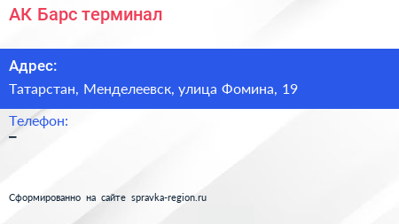 АК Барс, терминал по адресу Татарстан, Менделеевск, улица Фомина, 19 в дальнейшем Организация, размещена в следующих категориях: