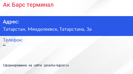 Ак Барс, терминал по адресу Татарстан, Менделеевск, Татарстана, 3а в дальнейшем Организация, размещена в следующих категориях: