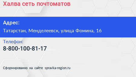 Халва, сеть почтоматов по адресу Татарстан, Менделеевск, улица Фомина, 16 в дальнейшем Организация, размещена в следующих категориях: