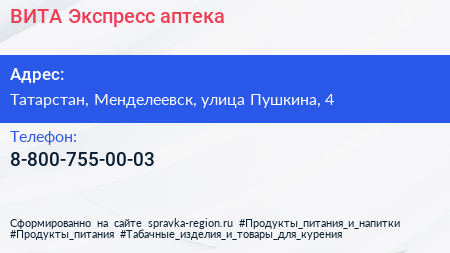 ВИТА Экспресс, аптека по адресу Татарстан, Менделеевск, улица Пушкина, 4 в дальнейшем Организация, размещена в следующих категориях: