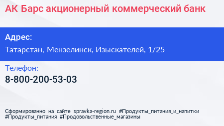 АК Барс, акционерный коммерческий банк по адресу Татарстан, Мензелинск, Изыскателей, 1/25 в дальнейшем Организация, размещена в следующих категориях: