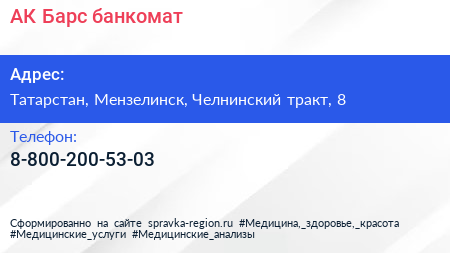 АК Барс, банкомат по адресу Татарстан, Мензелинск, Челнинский тракт, 8 в дальнейшем Организация, размещена в следующих категориях: