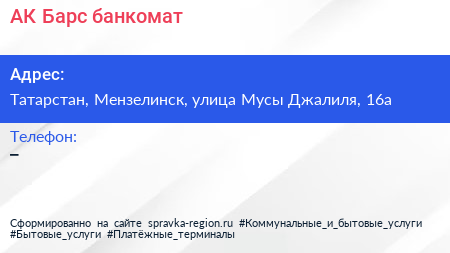 АК Барс, банкомат по адресу Татарстан, Мензелинск, улица Мусы Джалиля, 16а в дальнейшем Организация, размещена в следующих категориях: