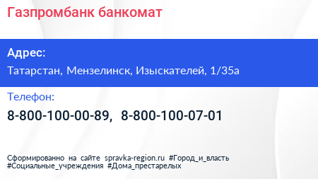 Газпромбанк, банкомат по адресу Татарстан, Мензелинск, Изыскателей, 1/35а в дальнейшем Организация, размещена в следующих категориях:
