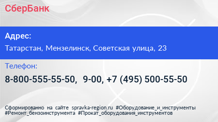 СберБанк по адресу Татарстан, Мензелинск, Советская улица, 23 в дальнейшем Организация, размещена в следующих категориях: