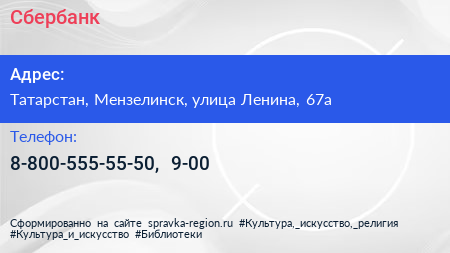 Сбербанк по адресу Татарстан, Мензелинск, улица Ленина, 67а в дальнейшем Организация, размещена в следующих категориях: