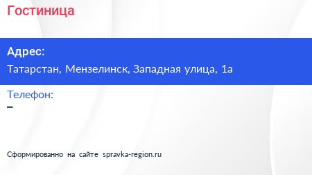 Гостиница по адресу Татарстан, Мензелинск, Западная улица, 1а в дальнейшем Организация, размещена в следующих категориях: