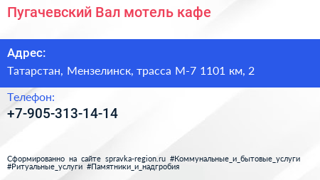 Пугачевский Вал, мотель-кафе по адресу Татарстан, Мензелинск, трасса М-7 1101 км, 2 в дальнейшем Организация, размещена в следующих категориях: