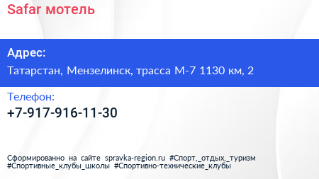 Safar, мотель по адресу Татарстан, Мензелинск, трасса М-7 1130 км, 2 в дальнейшем Организация, размещена в следующих категориях: