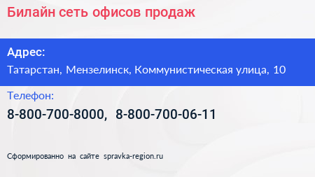Билайн, сеть офисов продаж по адресу Татарстан, Мензелинск, Коммунистическая улица, 10 в дальнейшем Организация, размещена в следующих категориях: