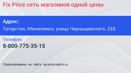 Fix Price, сеть магазинов одной цены по адресу Татарстан, Мензелинск, улица Чернышевского, 21Б в дальнейшем Организация, размещена в следующих категориях: