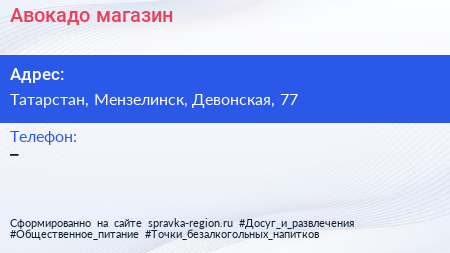 Авокадо, магазин по адресу Татарстан, Мензелинск, Девонская, 77 в дальнейшем Организация, размещена в следующих категориях: