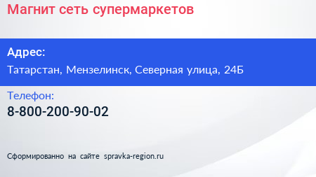 Магнит, сеть супермаркетов по адресу Татарстан, Мензелинск, Северная улица, 24Б в дальнейшем Организация, размещена в следующих категориях: