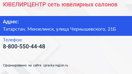 ЮВЕЛИРЦЕНТР, сеть ювелирных салонов по адресу Татарстан, Мензелинск, улица Чернышевского, 21Б в дальнейшем Организация, размещена в следующих категориях: