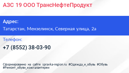 АЗС №19, ООО ТрансНефтеПродукт по адресу Татарстан, Мензелинск, Северная улица, 2а в дальнейшем Организация, размещена в следующих категориях: