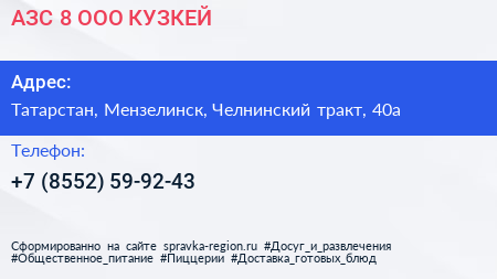 АЗС №8, ООО КУЗКЕЙ по адресу Татарстан, Мензелинск, Челнинский тракт, 40а в дальнейшем Организация, размещена в следующих категориях: