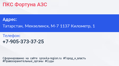 ПКС Фортуна, АЗС по адресу Татарстан, Мензелинск, М-7 1137 Километр, 1 в дальнейшем Организация, размещена в следующих категориях: