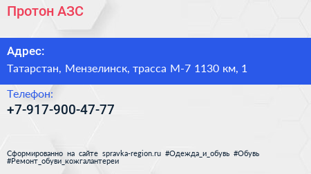 Протон, АЗС по адресу Татарстан, Мензелинск, трасса М-7 1130 км, 1 в дальнейшем Организация, размещена в следующих категориях: