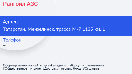 Рангойл, АЗС по адресу Татарстан, Мензелинск, трасса М-7 1135 км, 1 в дальнейшем Организация, размещена в следующих категориях: