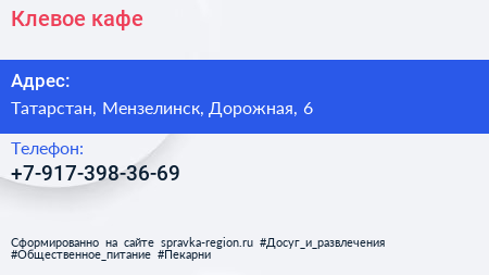 Клевое, кафе по адресу Татарстан, Мензелинск, Дорожная, 6 в дальнейшем Организация, размещена в следующих категориях: