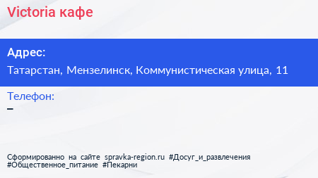 Victoria, кафе по адресу Татарстан, Мензелинск, Коммунистическая улица, 11 в дальнейшем Организация, размещена в следующих категориях: