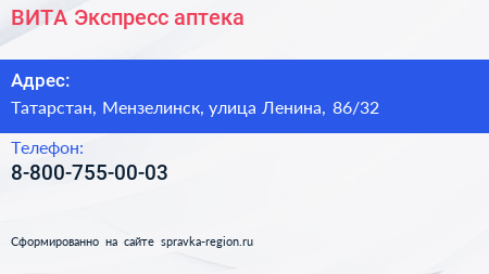 ВИТА Экспресс, аптека по адресу Татарстан, Мензелинск, улица Ленина, 86/32 в дальнейшем Организация, размещена в следующих категориях: