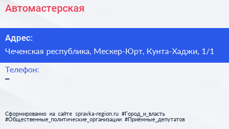 Автомастерская по адресу Чеченская республика, Мескер-Юрт, Кунта-Хаджи, 1/1 в дальнейшем Организация, размещена в следующих категориях: