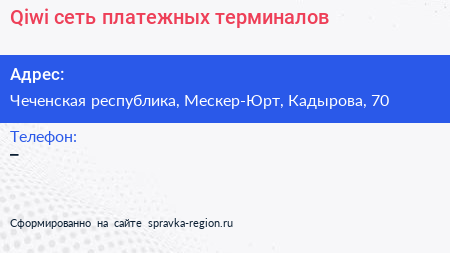 Qiwi, сеть платежных терминалов по адресу Чеченская республика, Мескер-Юрт, Кадырова, 70 в дальнейшем Организация, размещена в следующих категориях: