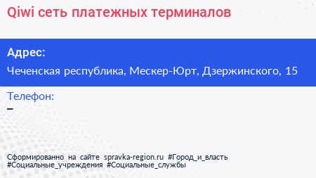 Qiwi, сеть платежных терминалов по адресу Чеченская республика, Мескер-Юрт, Дзержинского, 15 в дальнейшем Организация, размещена в следующих категориях: