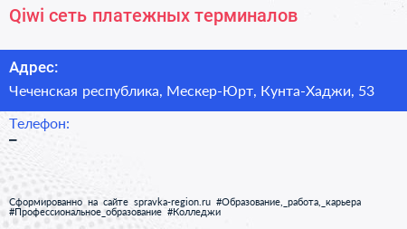 Qiwi, сеть платежных терминалов по адресу Чеченская республика, Мескер-Юрт, Кунта-Хаджи, 53 в дальнейшем Организация, размещена в следующих категориях: