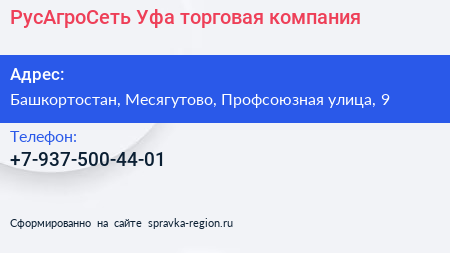 РусАгроСеть-Уфа, торговая компания по адресу Башкортостан, Месягутово, Профсоюзная улица, 9 в дальнейшем Организация, размещена в следующих категориях: