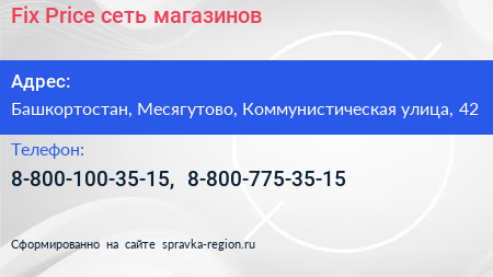 Fix Price, сеть магазинов по адресу Башкортостан, Месягутово, Коммунистическая улица, 42 в дальнейшем Организация, размещена в следующих категориях: