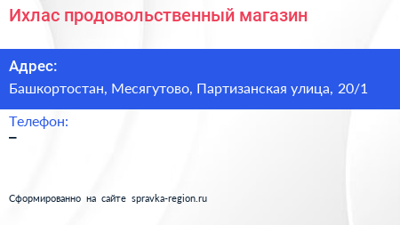 Ихлас, продовольственный магазин по адресу Башкортостан, Месягутово, Партизанская улица, 20/1 в дальнейшем Организация, размещена в следующих категориях:
