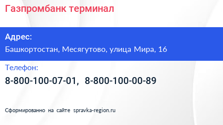 Газпромбанк, терминал по адресу Башкортостан, Месягутово, улица Мира, 16 в дальнейшем Организация, размещена в следующих категориях: