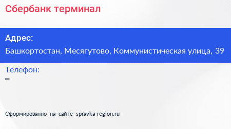 Сбербанк, терминал по адресу Башкортостан, Месягутово, Коммунистическая улица, 39 в дальнейшем Организация, размещена в следующих категориях: