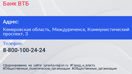 Банк ВТБ по адресу Кемеровская область, Междуреченск, Коммунистический проспект, 3 в дальнейшем Организация, размещена в следующих категориях:
