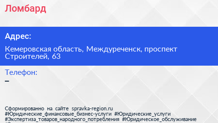 Ломбард по адресу Кемеровская область, Междуреченск, проспект Строителей, 63 в дальнейшем Организация, размещена в следующих категориях: