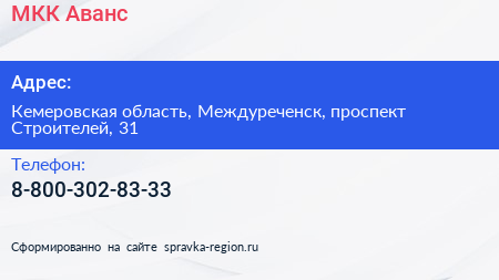 МКК Аванс по адресу Кемеровская область, Междуреченск, проспект Строителей, 31 в дальнейшем Организация, размещена в следующих категориях: