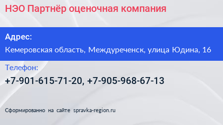 НЭО-Партнёр, оценочная компания по адресу Кемеровская область, Междуреченск, улица Юдина, 16 в дальнейшем Организация, размещена в следующих категориях: