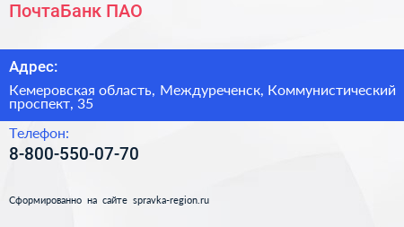 ПочтаБанк, ПАО по адресу Кемеровская область, Междуреченск, Коммунистический проспект, 35 в дальнейшем Организация, размещена в следующих категориях: