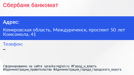 Сбербанк, банкомат по адресу Кемеровская область, Междуреченск, проспект 50 лет Комсомола, 41 в дальнейшем Организация, размещена в следующих категориях: