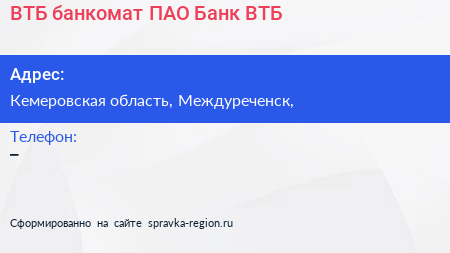 ВТБ, банкомат, ПАО Банк ВТБ по адресу Кемеровская область, Междуреченск, в дальнейшем Организация, размещена в следующих категориях: