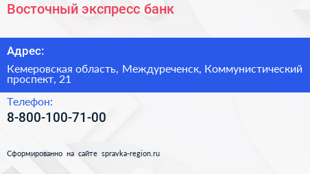 Восточный экспресс банк по адресу Кемеровская область, Междуреченск, Коммунистический проспект, 21 в дальнейшем Организация, размещена в следующих категориях: