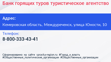 Банк горящих туров, туристическое агентство по адресу Кемеровская область, Междуреченск, улица Юности, 10 в дальнейшем Организация, размещена в следующих категориях: