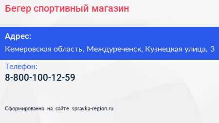 Бегер, спортивный магазин по адресу Кемеровская область, Междуреченск, Кузнецкая улица, 3 в дальнейшем Организация, размещена в следующих категориях: