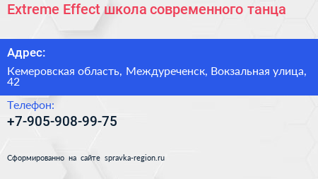 Extreme Effect, школа современного танца по адресу Кемеровская область, Междуреченск, Вокзальная улица, 42 в дальнейшем Организация, размещена в следующих категориях: