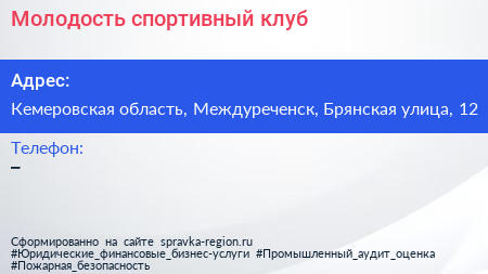 Молодость, спортивный клуб по адресу Кемеровская область, Междуреченск, Брянская улица, 12 в дальнейшем Организация, размещена в следующих категориях: