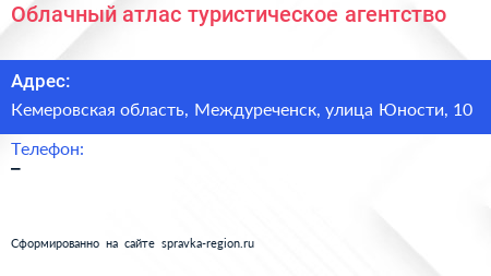 Облачный атлас, туристическое агентство по адресу Кемеровская область, Междуреченск, улица Юности, 10 в дальнейшем Организация, размещена в следующих категориях: