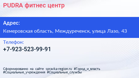 PUDRA, фитнес-центр по адресу Кемеровская область, Междуреченск, улица Лазо, 43 в дальнейшем Организация, размещена в следующих категориях: